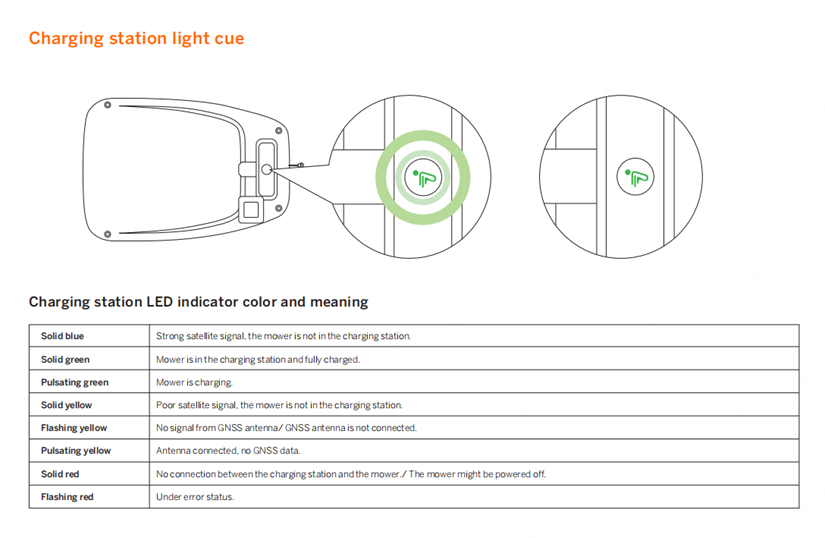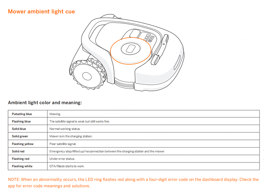 For information about the light cues on the charging station and the ambient light on the Navimow, please refer to the image below.