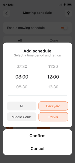 After creating the map of several zones, go to App Settings>MOWER>Mowing>Mowing Schedule, enable the mowing schedule, and then choose the specific zones when setting up the schedule, see the picture below, please do not forget to save the schedule.